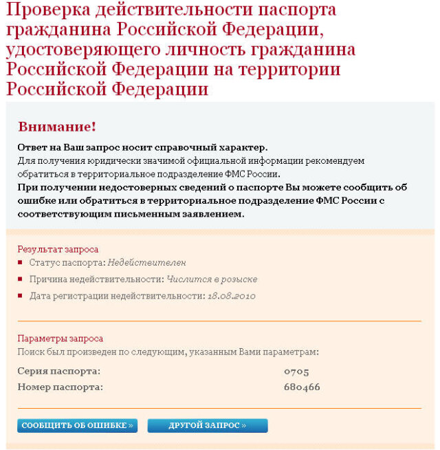 2.По данным ФМС паспорт значится в розыске с 2010 года в связи с утерей: