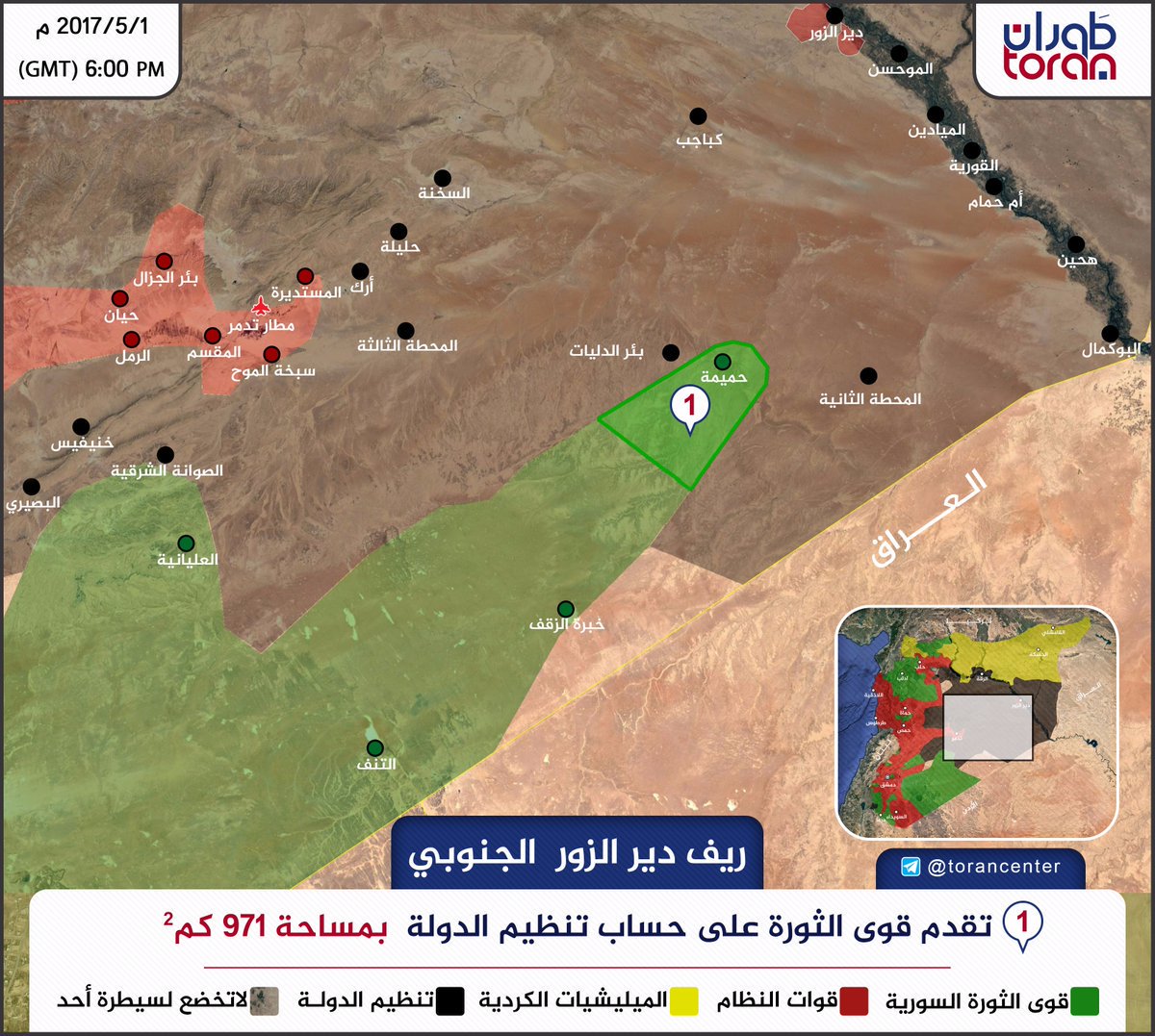 klok>> Интересная инфа и карта, зеленые поперли с юга Сирии вдоль границы с Ираком по направлению к Дэйр-эз-Зор...